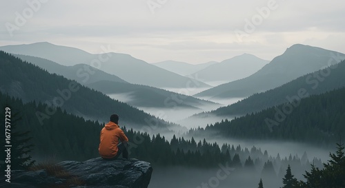 Man overlooking a misty mountain valley. Solitude, contemplation, and wanderlust concepts. Hiker in an orange jacket sitting on a cliff edge enjoying the serene and foggy landscape.