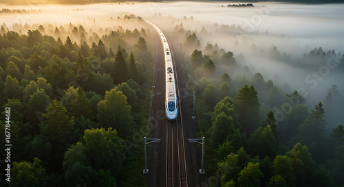 High-speed train journey through a misty forest at sunrise, aerial view of modern transport amidst nature's beauty