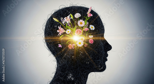 Beautiful mind concept with flowers blooming from human head silhouette, light glowing from within representing positive thoughts, emotional intelligence, and wellness