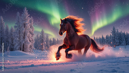 Christmas horse running through snowy forest under northern lights, magical winter scene full of energy and glowing atmosphere.