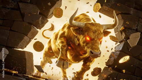 A gold bull charging through the wall, with cryptocurrencies in the air, bullish market trend and crypto investments concept.