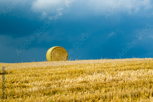Krajobraz żniwa skoszone pole na wzgórzu uprawne balot z siana.