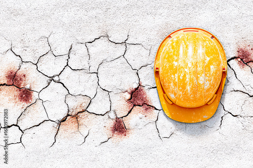 Żółty kask budowlany na popękanym, zardzewiałym betonowym tle – bezpieczeństwo pracy i zagrożenia