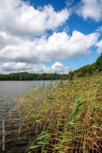 trzciny porastające brzeg jeziora falujące na wietrze, na niebie ogromne kłębiaste białe chmury