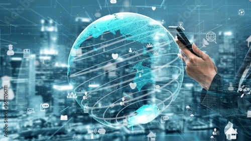 A person holds a smartphone while interacting with a digital globe, surrounded by network icons in an urban setting, representing modern technology and global connectivity. Xenic