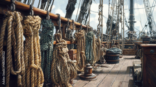 Historic tall ship deck with ropes rigging and nautical equipment