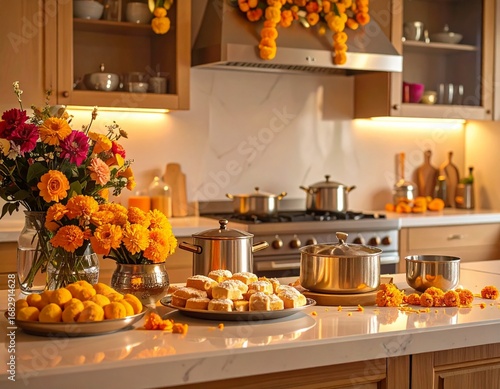 Aesthetic ultra realistic kitchen decorated for Diwali with fresh flowers, sweets