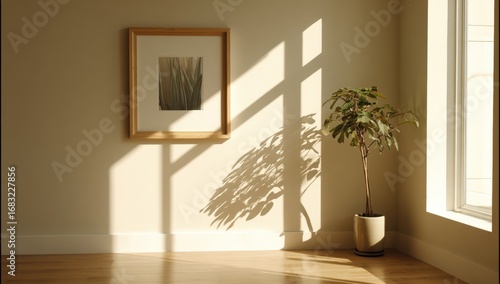 Sunlight streams into a room, casting shadows on a beige wall and hardwood floor. A framed print and potted plant are situated near a large window