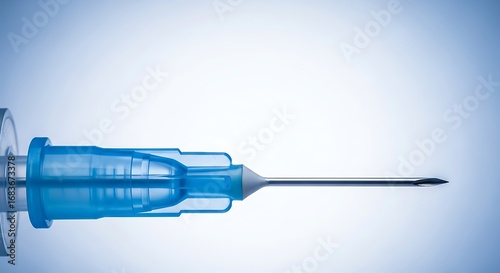 A macro photograph of a sharp hypodermic needle tip with a blue plastic hub on a light blue background.