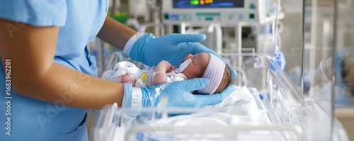 Newborn Care Nurse Holding Premature Baby in Incubator, Neonatal, NICU