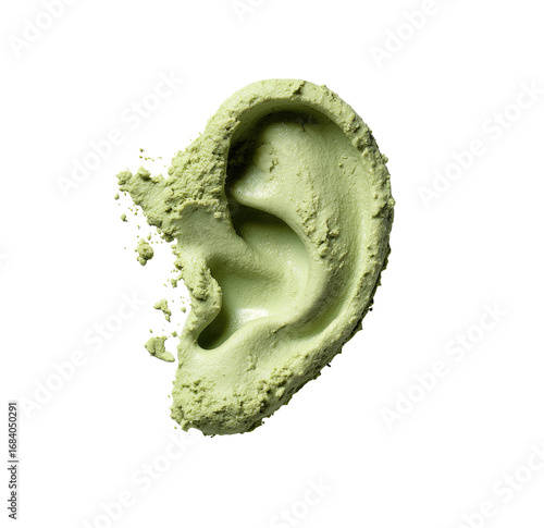 A light lime-green sculpted ear, textured and detailed, is isolated against a black background. The form is remarkably lifelike, with visible cartilage folds and inner details