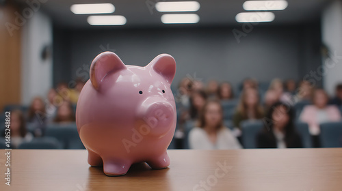 #1067766051A piggy bank stands on the floor of an empty car showroom, symbolising savings and financial goals amidst the sleek, polished vehicles in the vast, quiet space