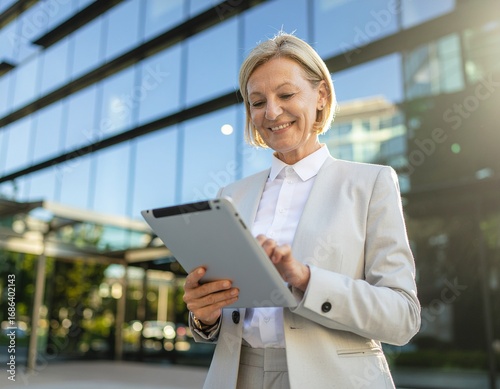 Portrait of Successful Businesswoman Using Digital Tablet in Front of Modern Office Building