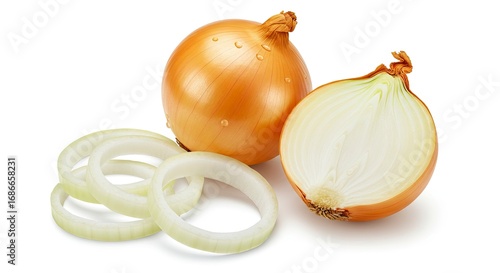 A raw onion sliced onion and a whole onion on a white background
