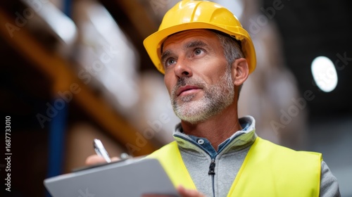 A warehouse manager inspecting goods and checking shipment labels for accuracy in a large distribution center