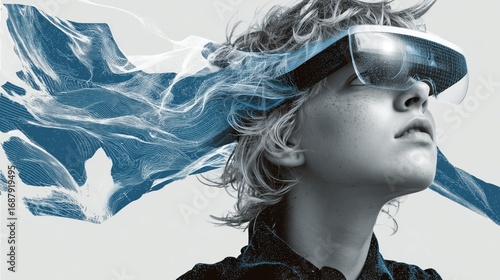 A woman wearing augmented reality glasses with digital overlay isolated on a white background