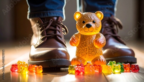 Gummy Bear with Colorful Candies and Leather Boots on Wooden Floor