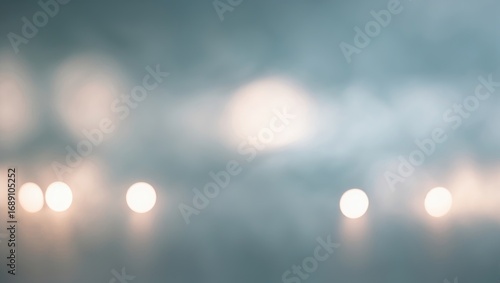 Foggy night scene with blurred lights reflecting on water, creating a peaceful and mysterious atmosphere.