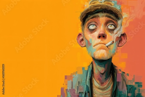Un retrato expresionista de un hombre con mirada perdida, fumando un cigarrillo en un fondo naranja pixelado.