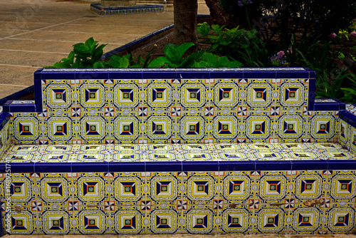 miejska ławaka wykonana z ceramicznych płytek ułozonych w mozikę, Hiszpania, ławka pokryta białymi i niebieskimi płytkami, Spain, Old bench covered with white and blue tiles on a city street