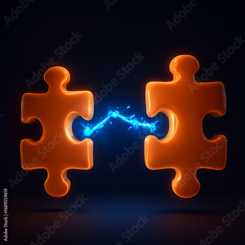 Dwa elementy układanki połączone energią elektryczną. Koncepcja połączenia, rozwiązania i synergii.