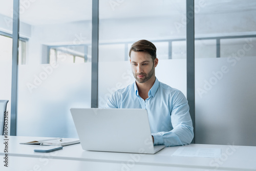 Young professional specialist latin hispanic business man working on laptop pc sitting at desk in modern office space. European businessman entrepreneur using computer technology app for work online