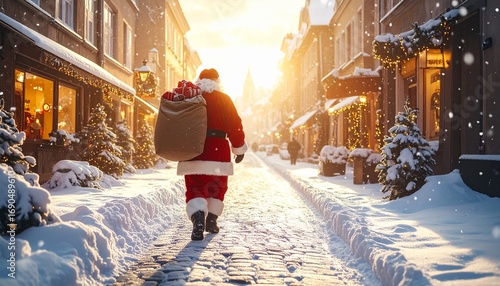 雪に覆われたヨーロッパの石畳の街並みを、サンタクロースがプレゼントの袋を背負って歩きます。 朝日に照らされた雪の結晶がキラキラと輝き、ショップの温かい光が雪に反射します。 静かな冬の街の雰囲気を表現し、広いネガティブスペースが確保されています。 クリスマス広告、ブランド素材、SNSコンテンツに最適です。