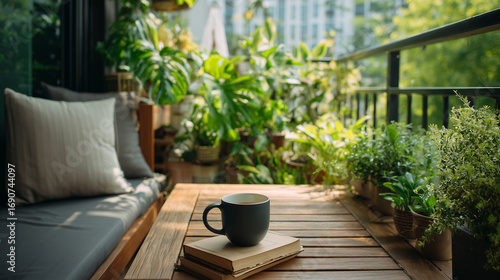 Przytulny, zielony balkon z drewnianym stołem i sofą. Filiżanka na książce, a wokół bujna roślinność tworzą relaksującą atmosferę, idealną do odpoczynku.