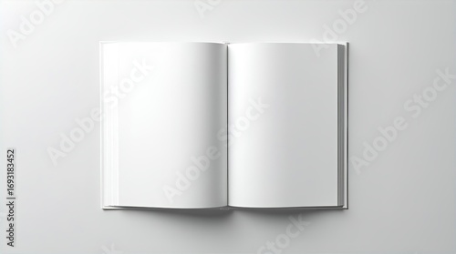 Open blank white book or magazine mockup with empty pages on a clean white background. Top view flat lay for publication design, branding, and copy space template.