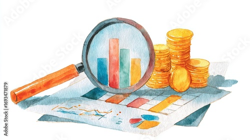A watercolor illustration featuring a magnifying glass over a chart and stacked coins, symbolizing analysis and financial growth.