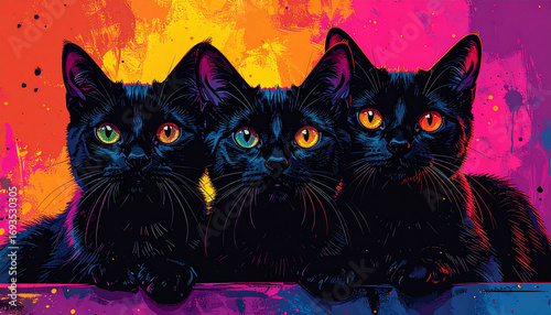 Three black kittens with vibrant colorful backgrounds, showcasing expressive eyes.