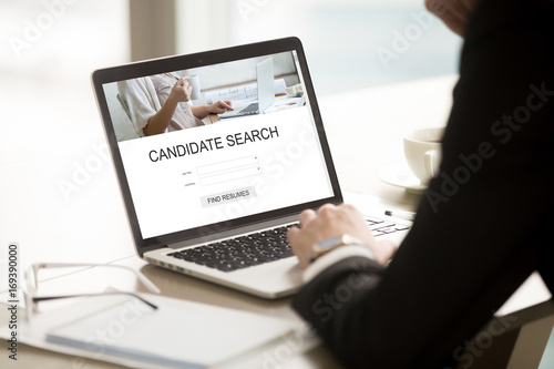 Businessman using resume web search on laptop, company executive choosing applications and cvs online, recruiter headhunting professionals, human resource management, close up view, focus on screen