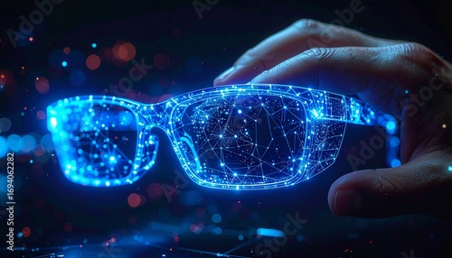 Captivating image showcasing a pair of digital glasses, with a human hand holding the glasses. The glasses have a cool blue tone, exuding a modern and futuristic vibe