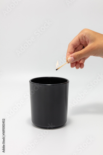 Świeczka zapachowa. Dłoń z zapałką zapala świeczkę