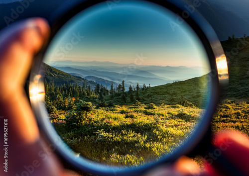 Panorama di montagna visto attraverso una lente di ingrandimento