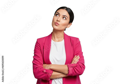 Thoughtful business woman looking upwards with arms crossed in pink blazer stock photo isolated on transparent background