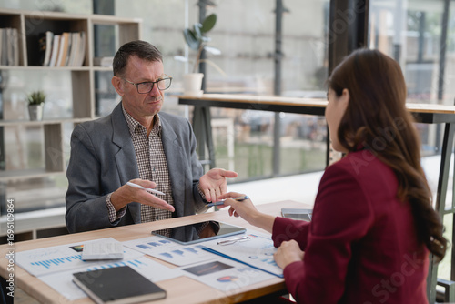 Two businesspeople sitting at desk in modern office discussing about financial charts and graphs showing results are disappointing, businessman gesturing with hands