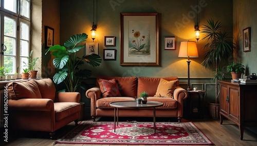 Cozy living room with vintage furniture, warm lighting, and antique details creating a nostalgic atmosphere Perfect for home decor, interior design, and vintage lifestyle blogs , armchair, aesthetic