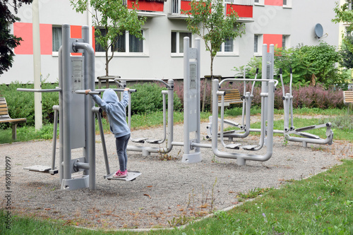 Mała dziewczynka ćwiczy w siłowni plenerowej