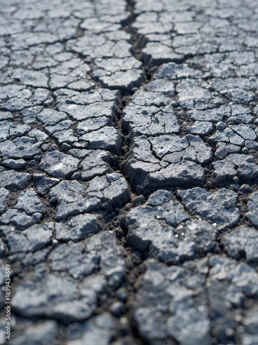 A closeup view of asphalt during the cooling process revealing a textured surface that portrays small cracks and fissures hinting at the materials pliability and the early signs of