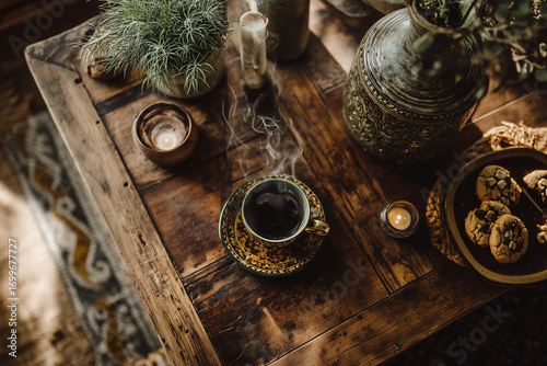 Świeżo zaparzona kawa z ciasteczkami, widok z góry w rustykalnym wnętrzu – przytulny poranek