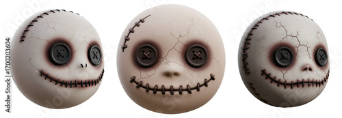 Eerie cracked doll faces with button eyes and stitched smiles evoke a creepy, unsettling, yet captivating Halloween vibe with transparent background