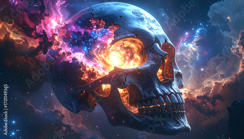 Skull cracked open with glowing galaxy inside, cosmic Halloween surreal design