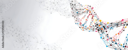 Abstract dna strand connecting on a white surface with colorful nodes representing genetic information and scientific research, creating a modern and technological feel.
