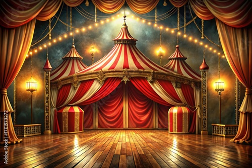 Vintage circus tent stage backdrop with warm lighting and detailed design.