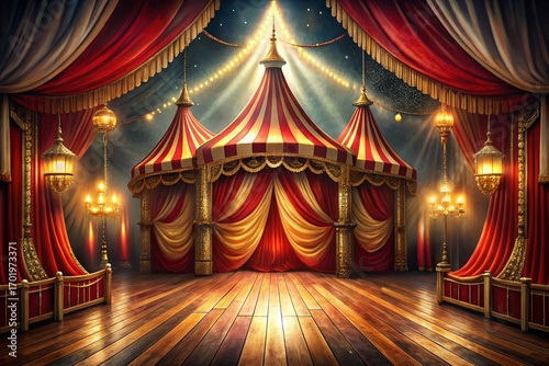 A grand circus tent with red and gold curtains, illuminated by warm lights, set on a wooden stage.