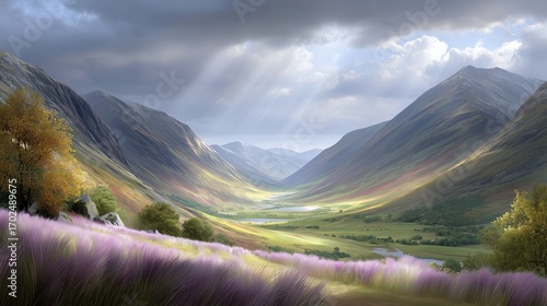 Dramatic Sunbeams Illuminate a Majestic Mountain Valley with Vibrant Purple Grass and Autumn Trees