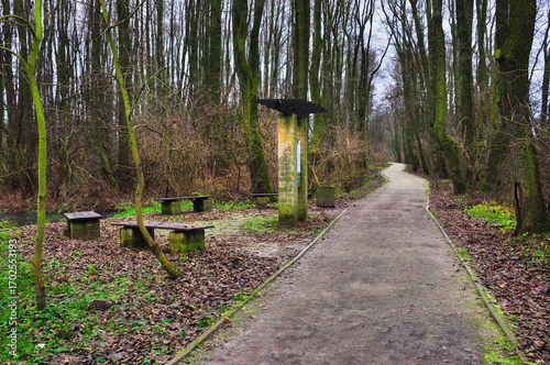 Lubin - Dolina Zimnicy. Ścieżka przez las z ławkami w cichy jesienny dzień. Spokojny leśny krajobraz z alejką z ławkami wśród naturalnego piękna i spokoju.