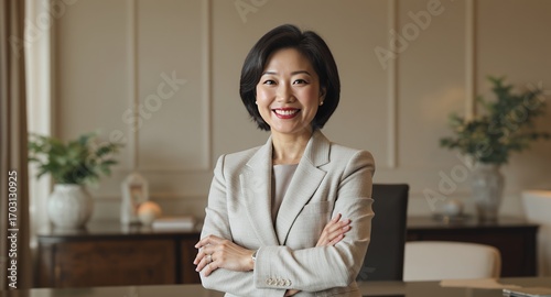 Smiling businesswoman portrait, professional confident female executive, arms crossed, beige blazer, business attire, corporate headshot, indoor office, elegant style, successful career, leadersh