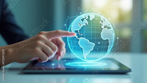 Dedos tocando la pantalla de una tableta digital con una proyección holográfica de la Tierra que simboliza la sostenibilidad ambiental y la conexión global de datos